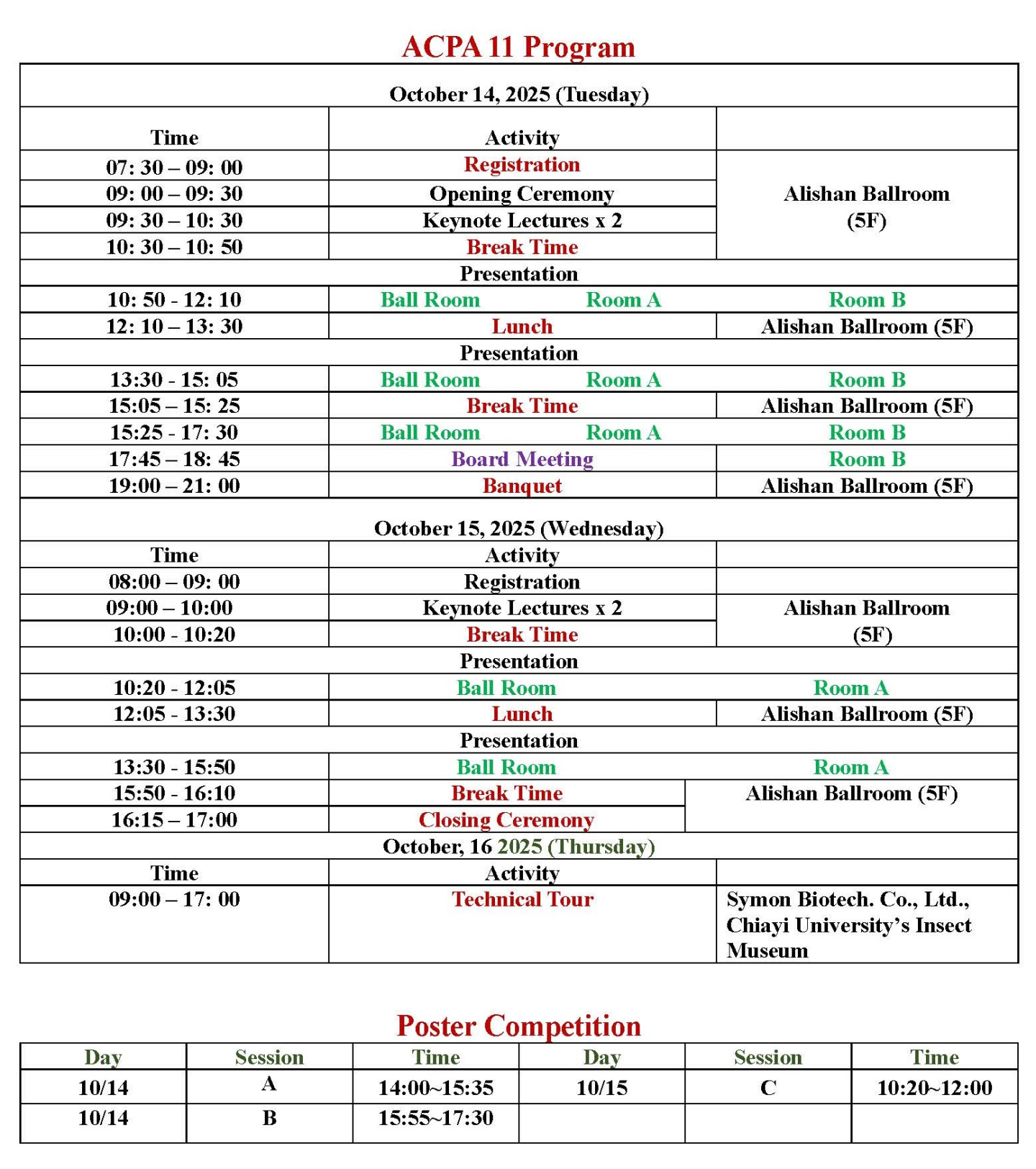 This schedule provides a concise overview of the main activities of ACPA 11, held from October 14 to 16, 2025. It highlights the key sessions and events to help participants quickly understand the overall conference flow. [Download ACPA 11 Full Conference Schedule (PDF)]